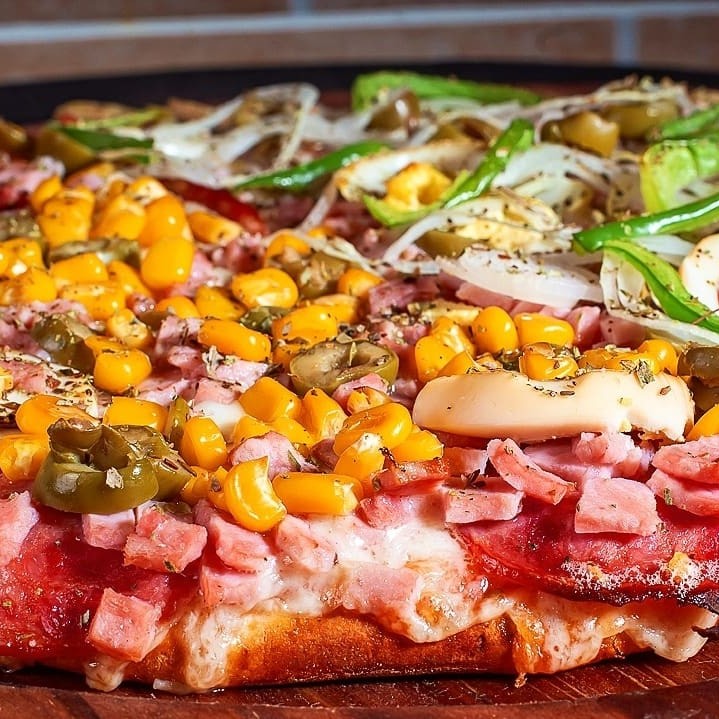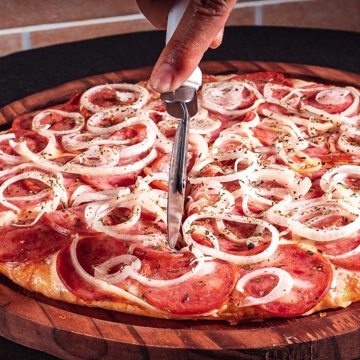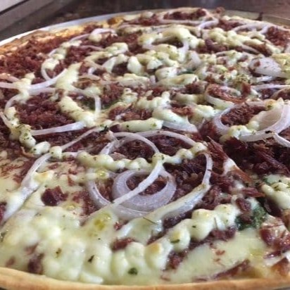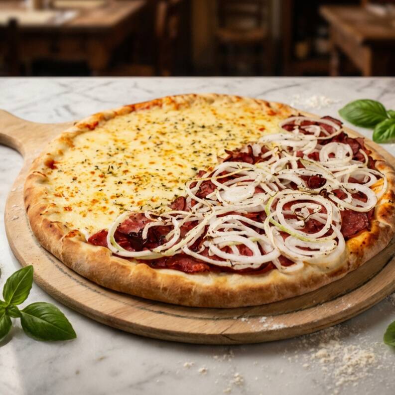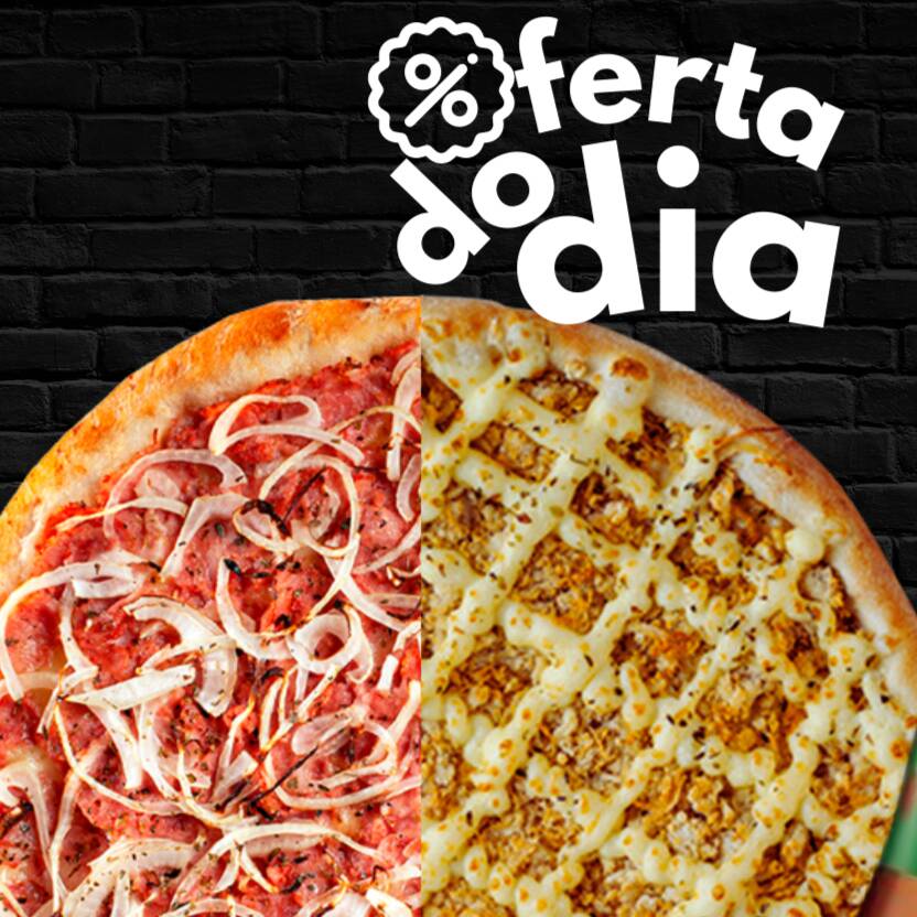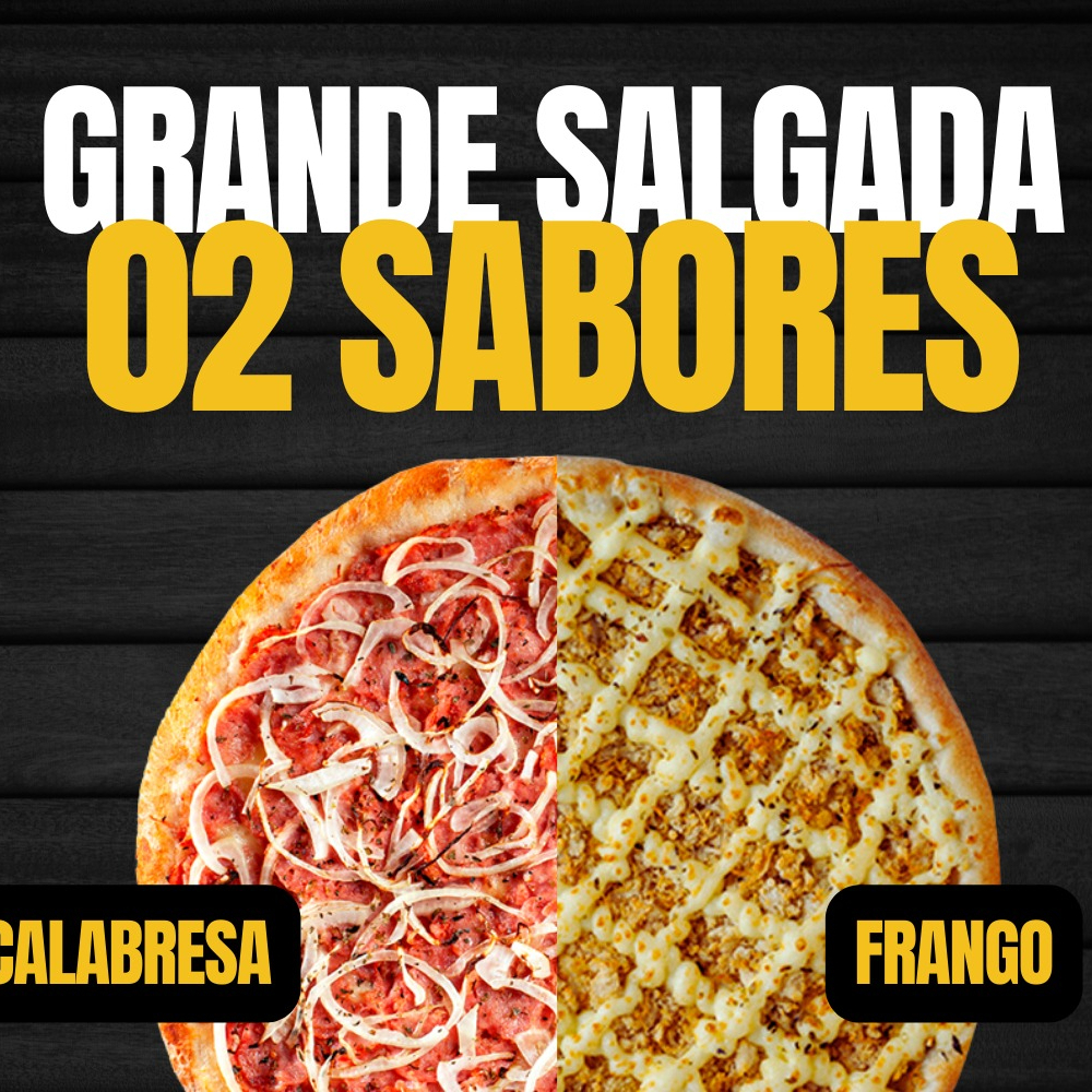 1 Pizza grande (35cm) com 8 pedaços, sendo metade de Calabresa com Cebola e a outra com Muçarela bem cremosa