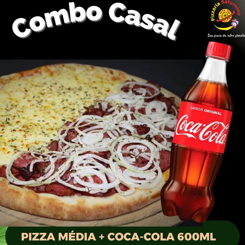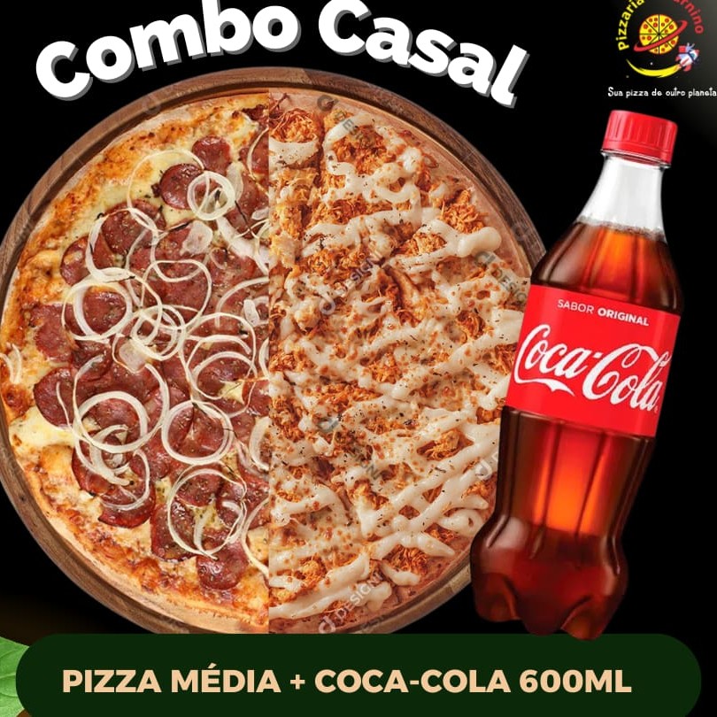 1 Pizza Média com 6 pedaços (30cm) sendo metade no sabor de Calabresa acebolada e a outra metade no sabor de Frango com Catupiry bem cremosa e para acompanhar uma Coca-Cola 600ml Tradicional ou Zero super gelada esperando você pedir!