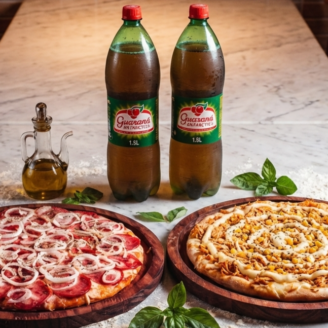 Combo com 2 Pizzas Grandes (35cm) + 2 unidades de Guaraná Antarctica 1,5l, perfeito para a galera curtir!