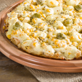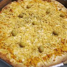 Molho, mussarela, frango, milho, catupiry, batata palha, orégano e azeitonas.
