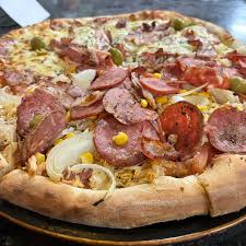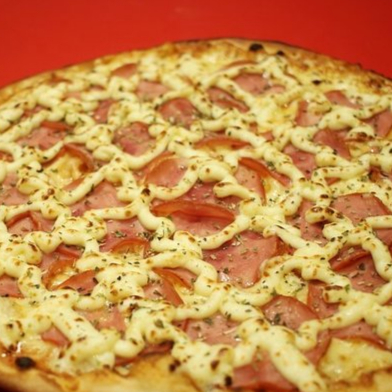 Molho, mussarela, presunto, calabresa, tomate, milho, bacon, orégano e azeitonas.