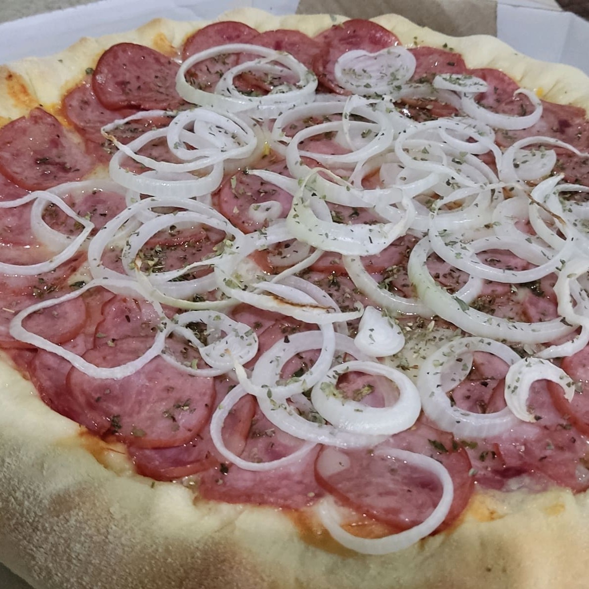 molho de tomate, mussarela, bacon, oregano, cebola