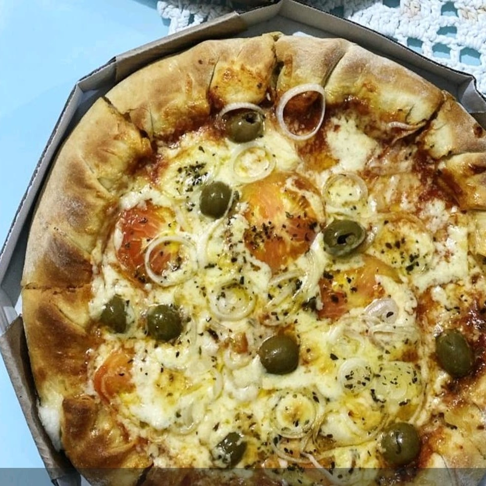 molho de tomate ,mussarela,tomate, azeitona, oregano, cebola
