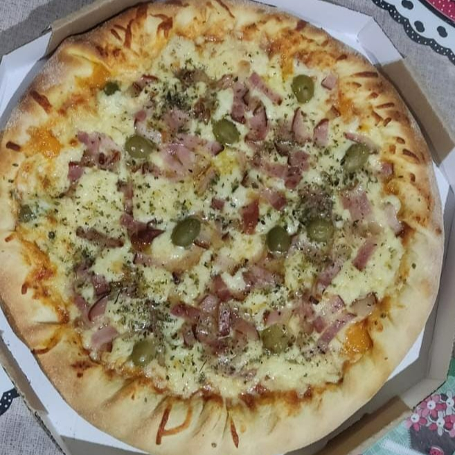 molho de tomate, mussarela, tomate, lombo, oregano, cebola, azeitona