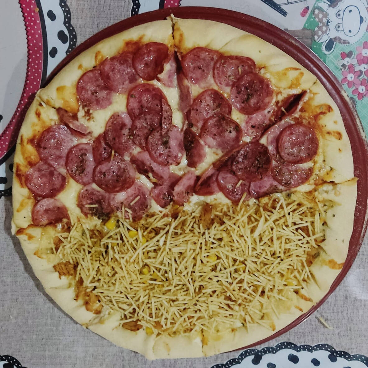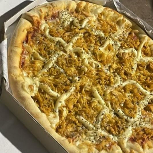 molho de tomate , mussarela ,frango, milho, creme de leite, batata palha