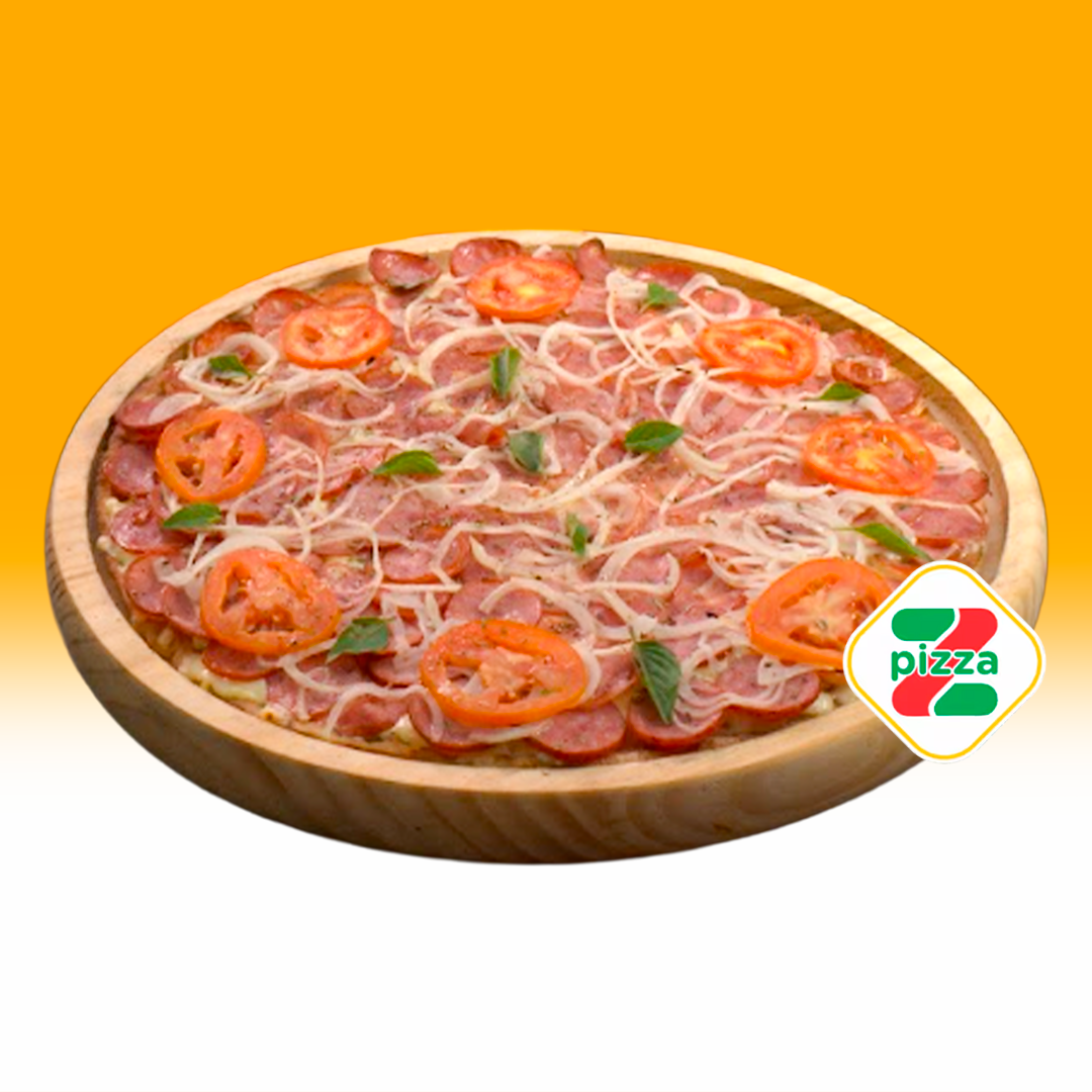 Massa-Molho-Mussarela-Calabresa-Cebola-Orégano-Tomate-Manjericão