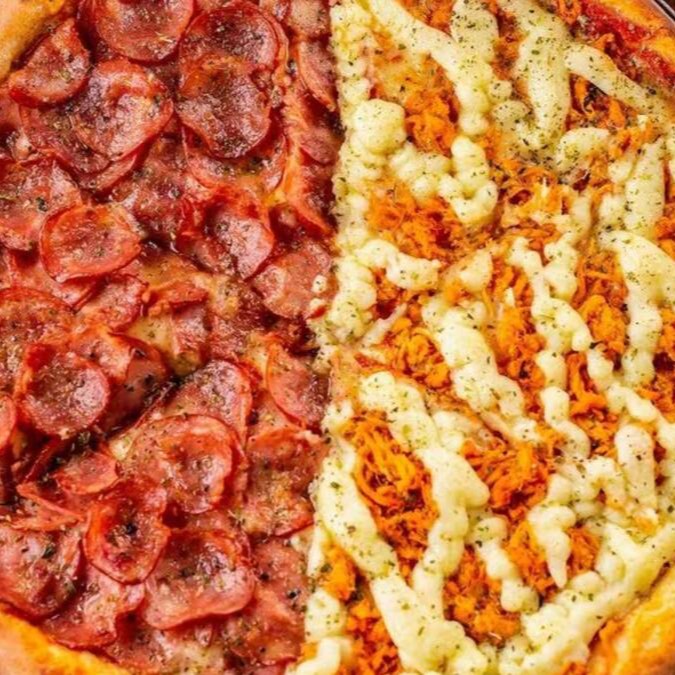 Metade Frango Desfiado com Catupiry Cremoso e Metade Bacon Crocante com Muçarela Derretida. Sabor e Texturas Irresistíveis!