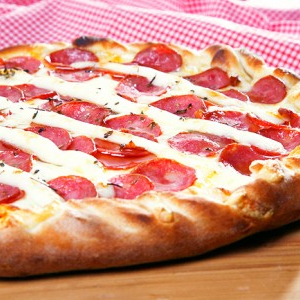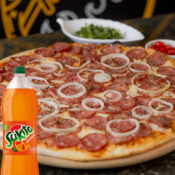 Pizza Grande de Calabresa Bem Douradinha Com Molho Especial, Mussarela Derretida e Orégano, Acompanhada de Um Refrigerante Geladinho. Combo Intenso e Irresistível. Peça Agora!