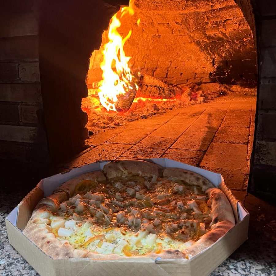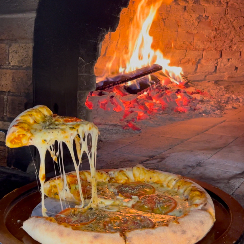 Molho, muçarela, bacon, tomate,cebola e orégano.