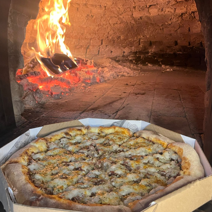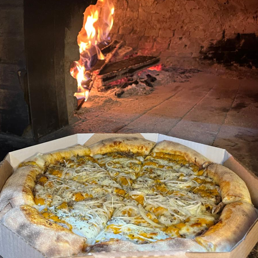 Molho, muçarela, carne seca, calabresa, cebola e orégano.