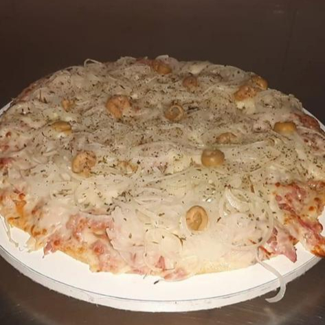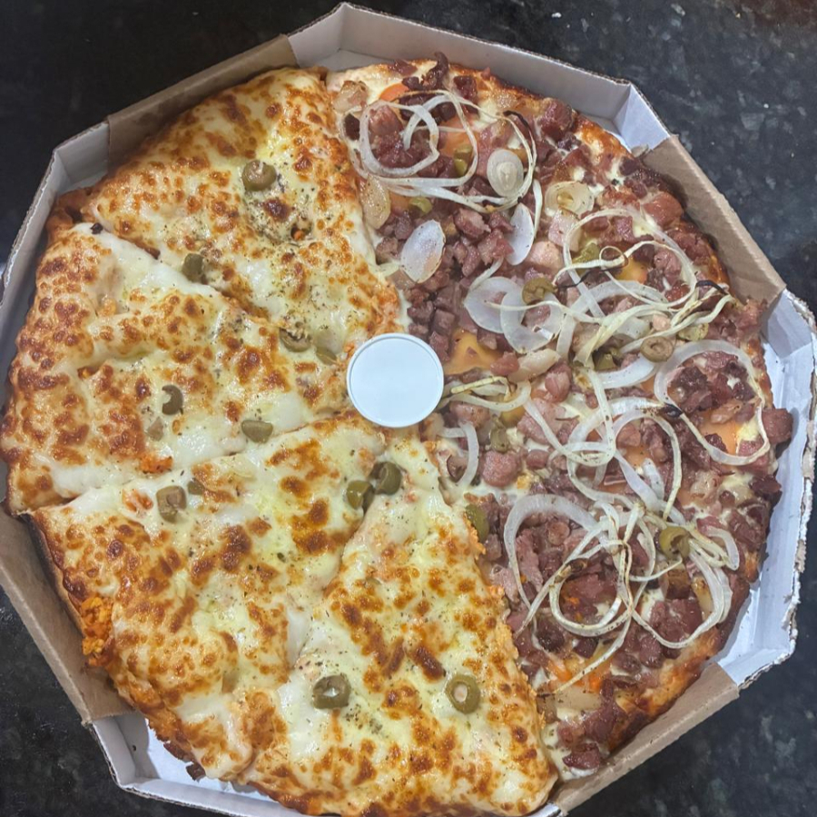 Bacon - Molho, Mussarela, Bacon, Cebola, Orégano, Tomatee Azeitona. / Frango Com Catupiry -Molho, Mussarela, Frango Desfiado, Catupiry,Orégano e Azeitona.