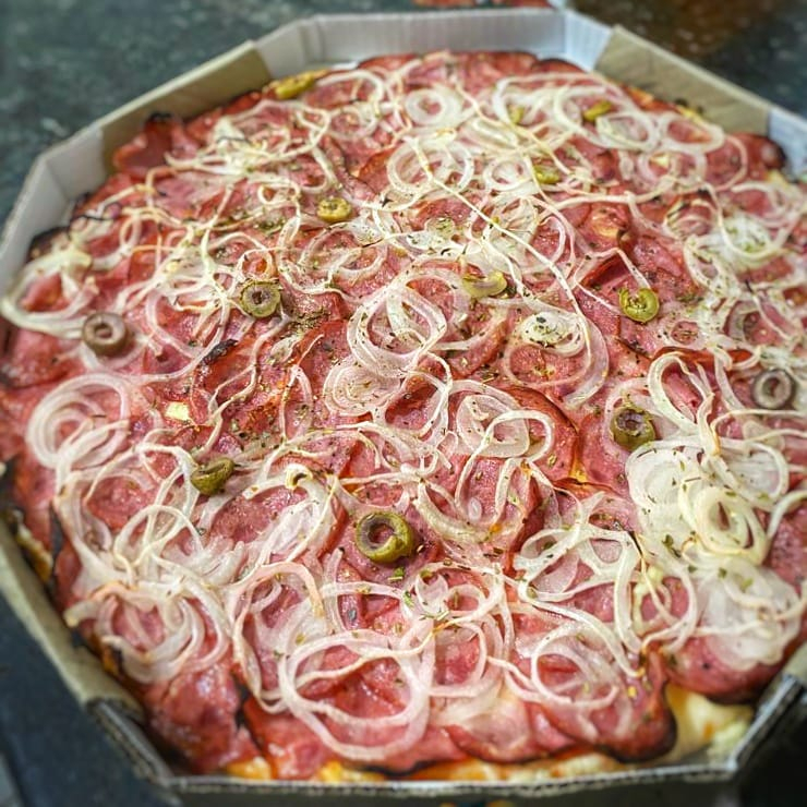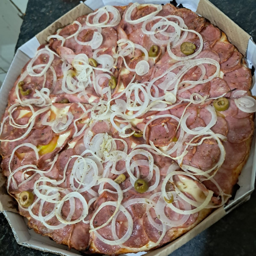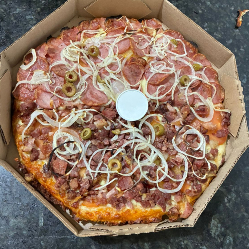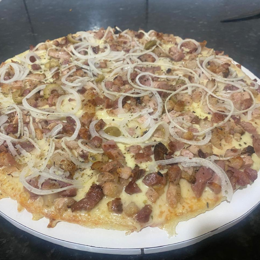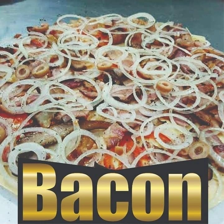 Molho, Mussarela, Bacon, Cebola, Orégano, Tomatee Azeitona.