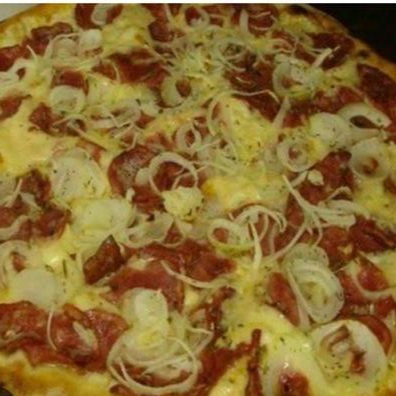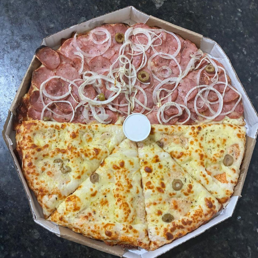 Bacon - Molho, Mussarela, Bacon, Cebola, Orégano, Tomatee Azeitona / Calabresa Molho, Mussarela, Calabresa, Cebola,Tomate, Orégano e Azeitona .
