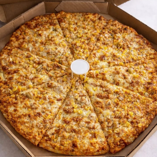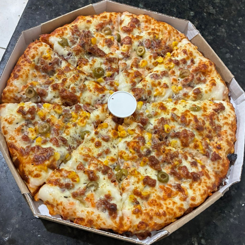 Molho, Mussarela, Frango Desfiado, Bacon, Catupiry, Milho Verde, Orégano e Azeitona.