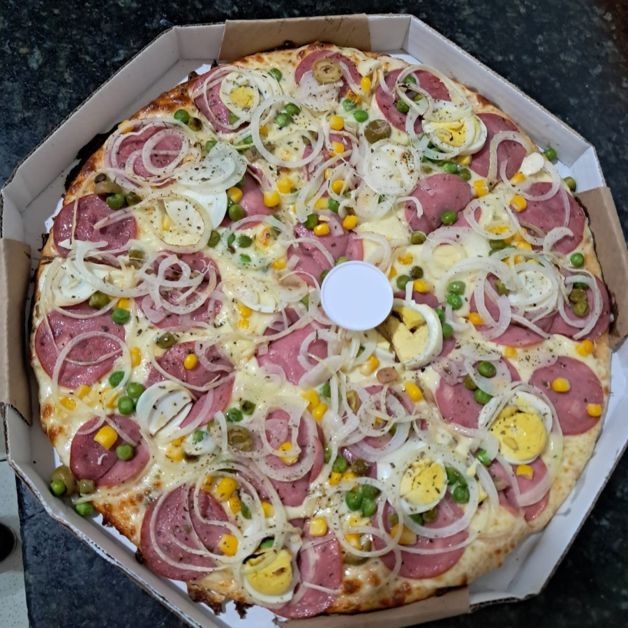 Molho, Mussarela, Apresuntado, Calabresa, Palmito Picado, BaconTomate Picado, Ovos, Milho Verde, Ervilha, Cebola, Orégano e Azeitona
