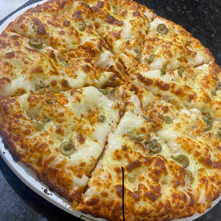 Molho, Mussarela, Frango Desfiado, Catupiry, Provolone, Orégano e Azeitona.