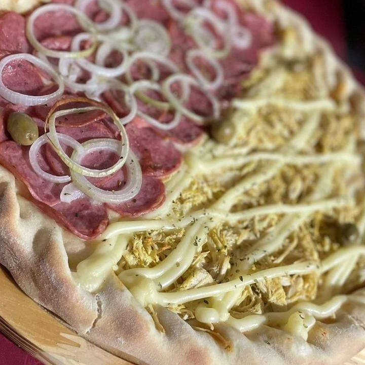 Molho napoles, mussarela, presunto, fraango, calabresa, bacon, milho, pimentao, azeitona e oregano