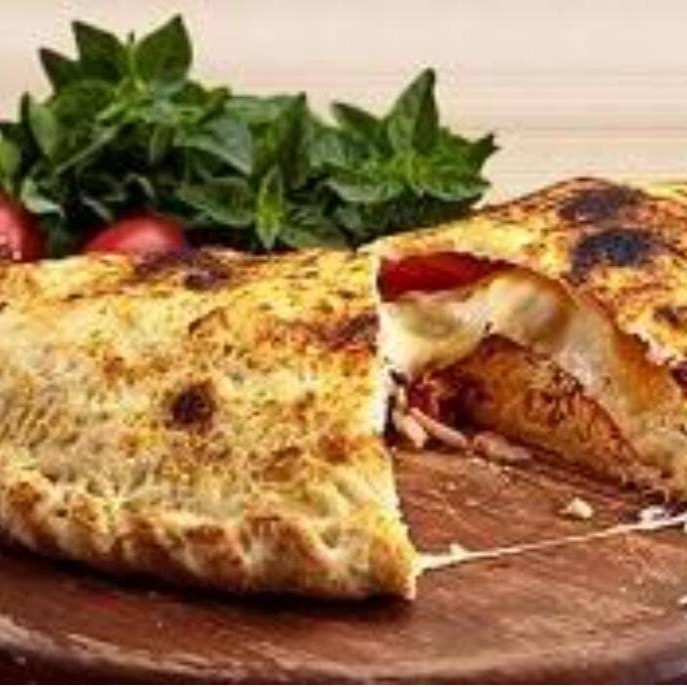 Pizza clássica com molho de tomate, presunto, cebola, azeitonas, ovos e queijo mussarela.