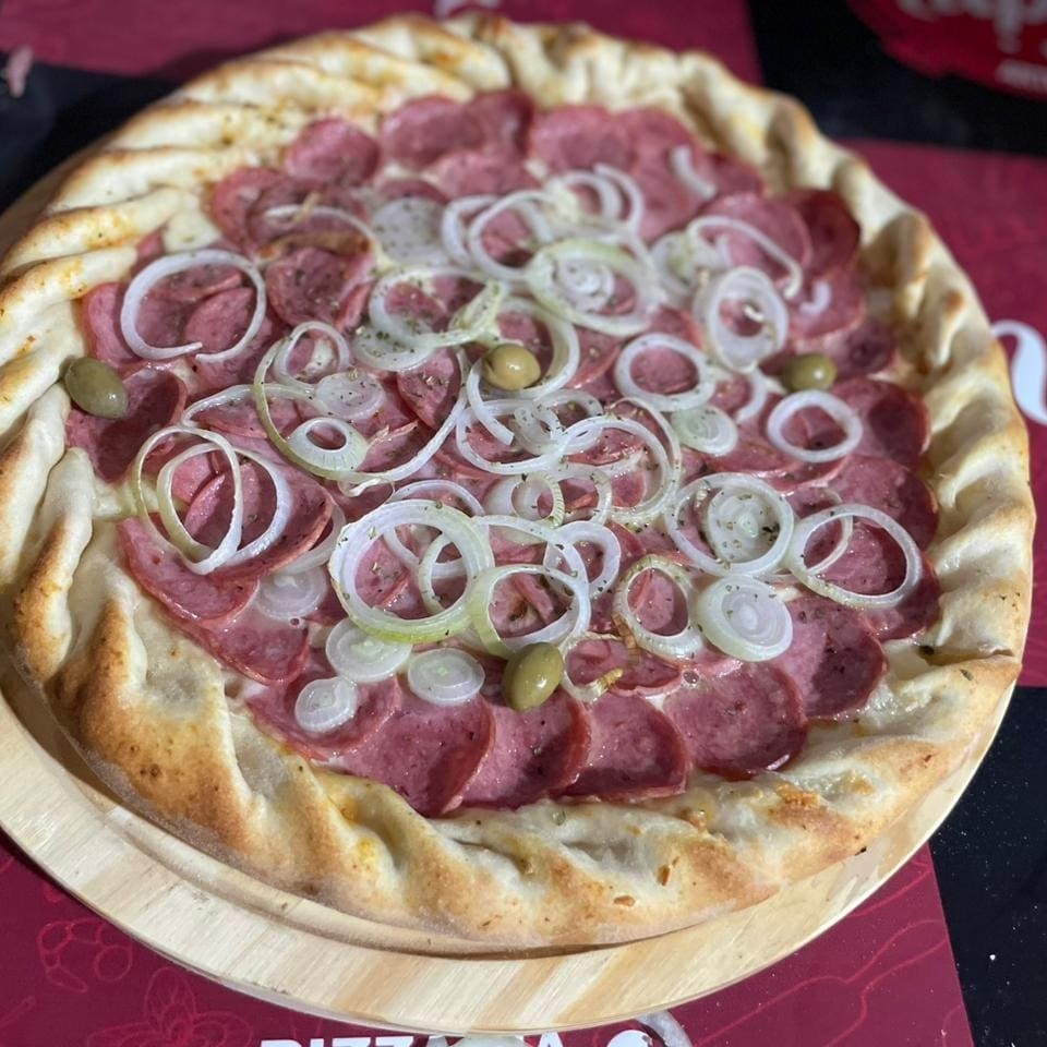 Deliciosa pizza com fatias de calabresa, cebola roxa e azeitonas pretas.
