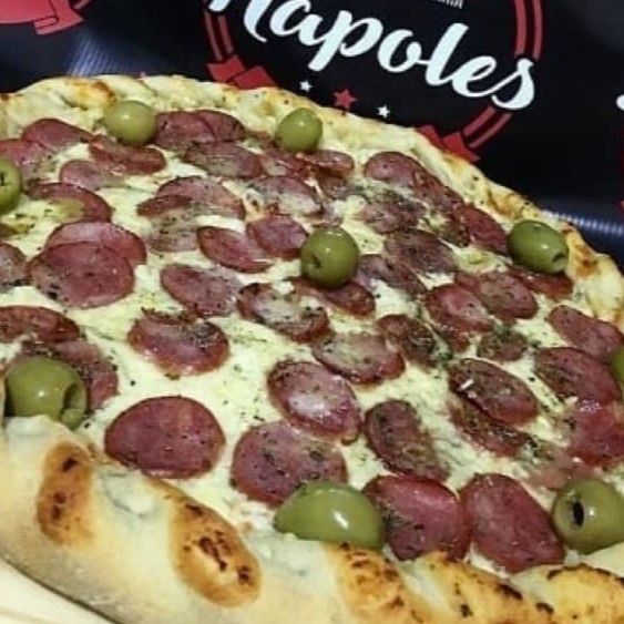 Molho napoles, mussarela, calabresa pimenta calabresa, oregano e azeitona