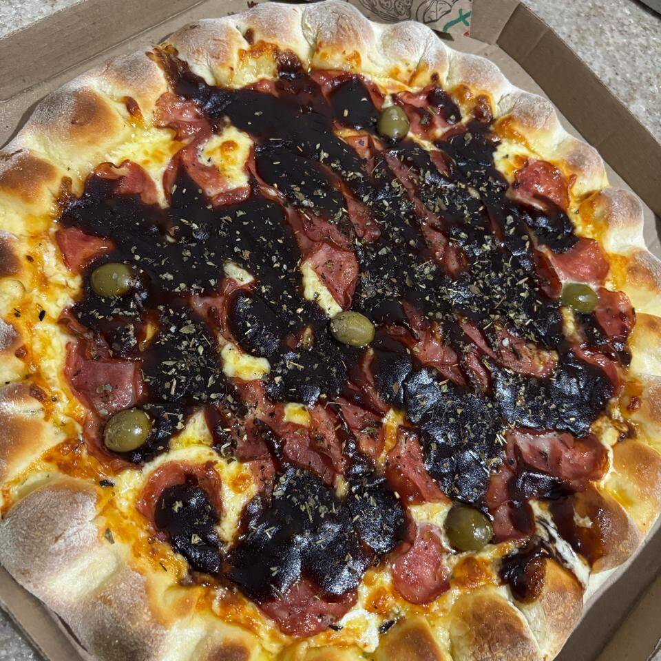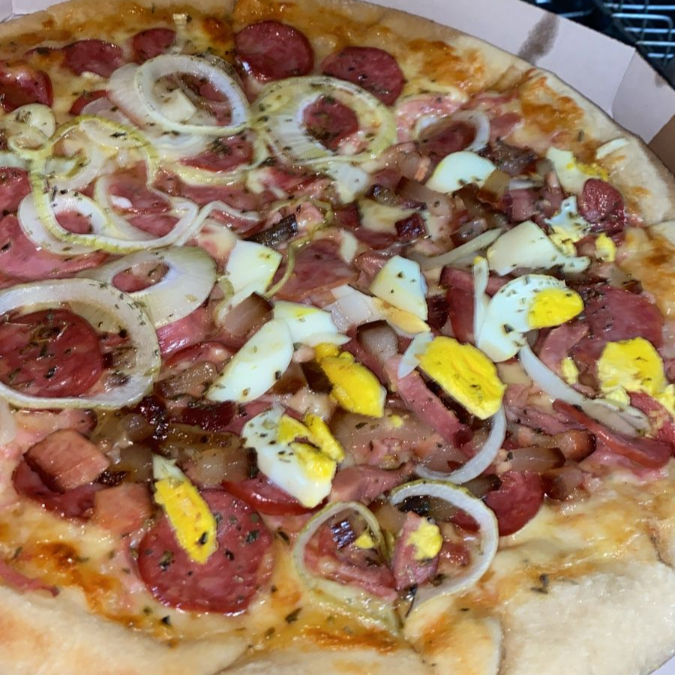 Molho, mussarela, calabresa, barbecue, cebola, azeitona e orégano.