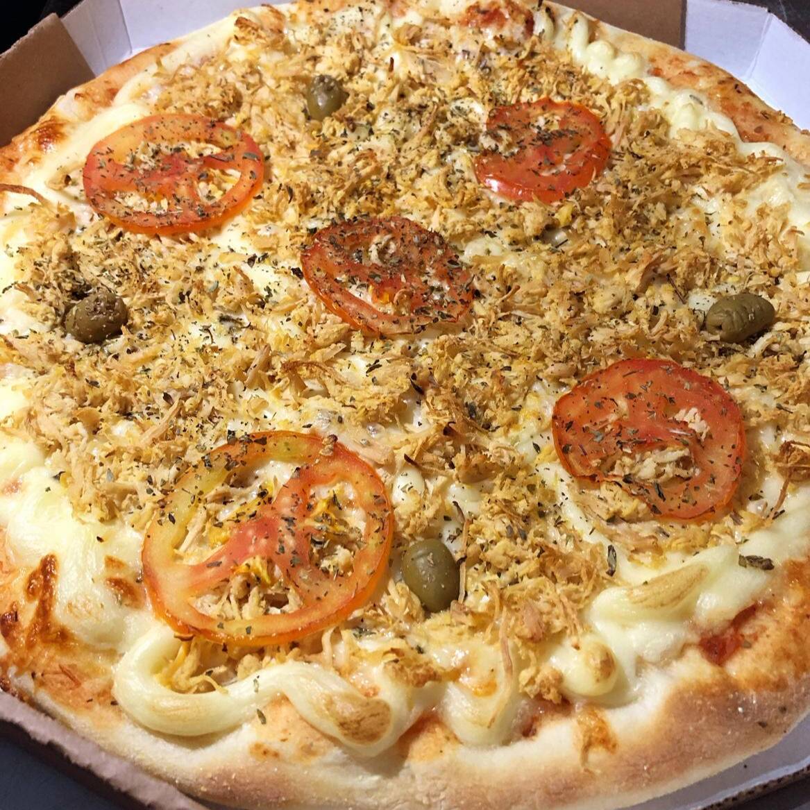 Molho, mussarela, frango, catupiry, tomate, milho, azeitona e orégano.