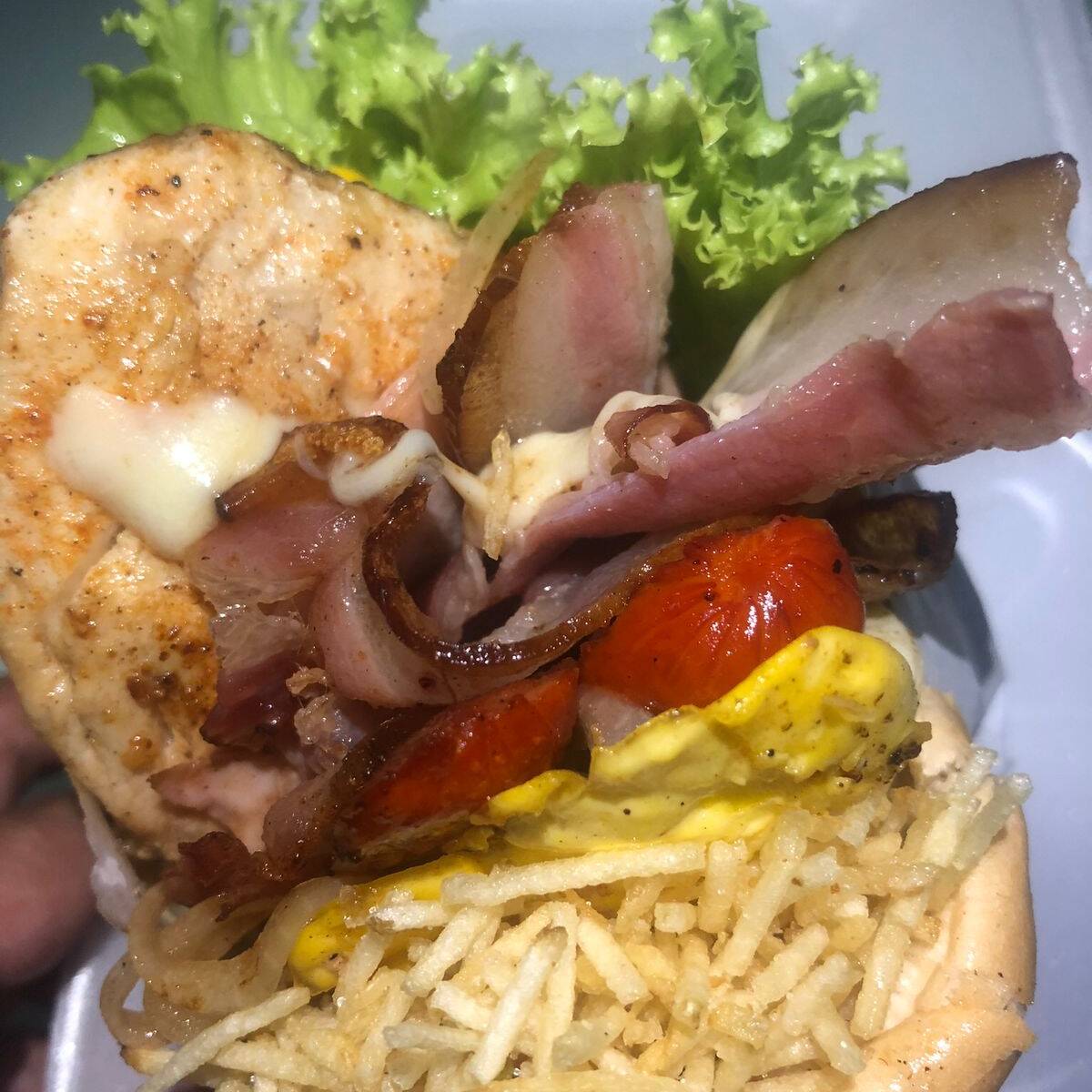 (Pão, frango, bacon, ovo, mussarela, presunto, alface, tomate, milho e batata palha)