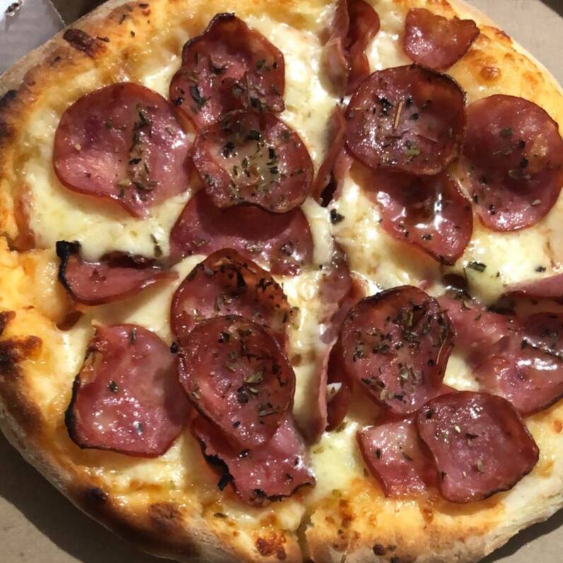 Molho, mussarela, calabresa, bacon, azeitona e orégano.