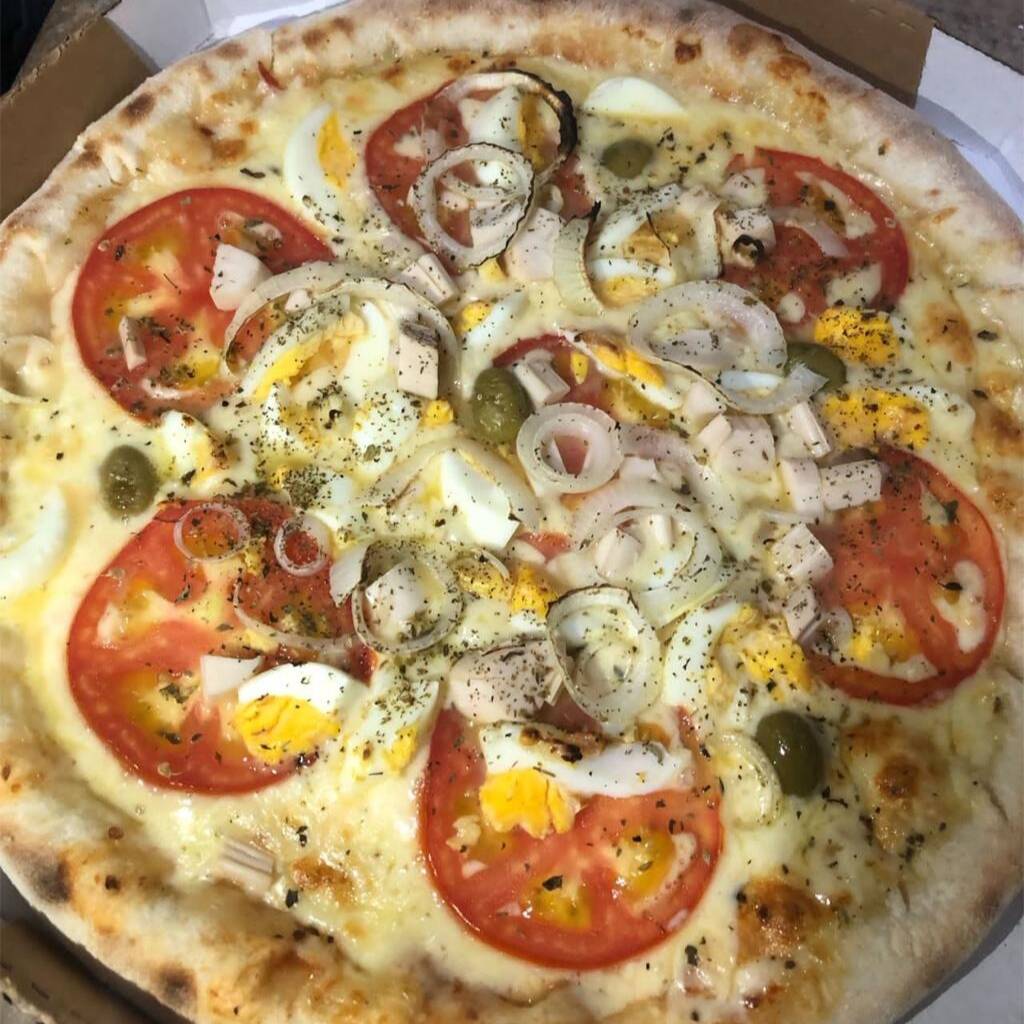 Molho, mussarela, presunto, tomate, cebola, azeitona e orégano.