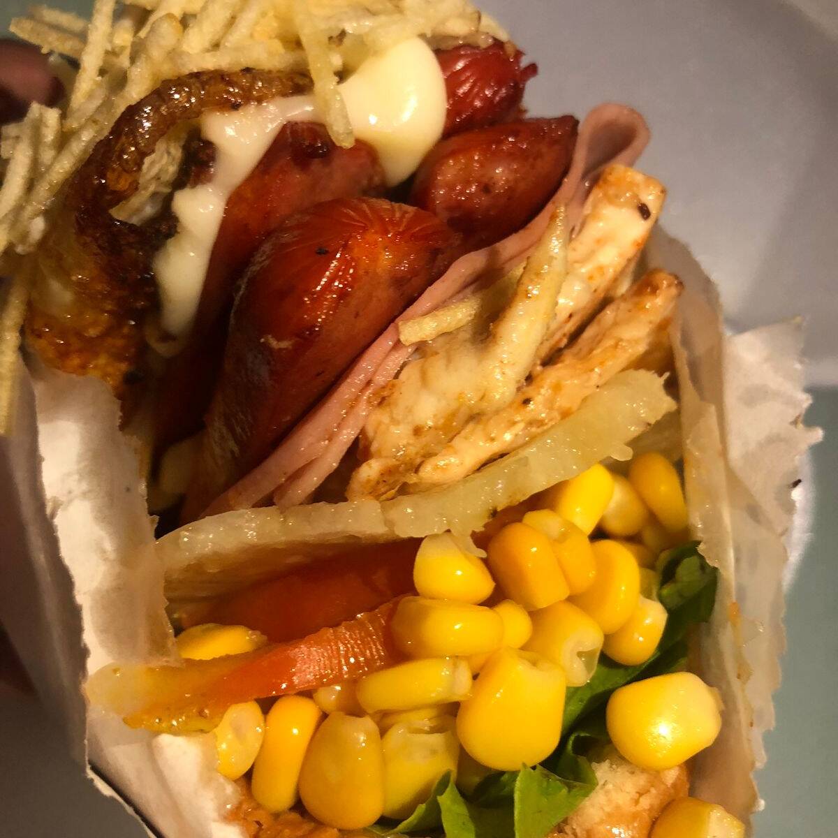 (Pão, frango, bacon, ovo, salsicha, mussarela, presunto, alface, tomate, milho e batata palha)