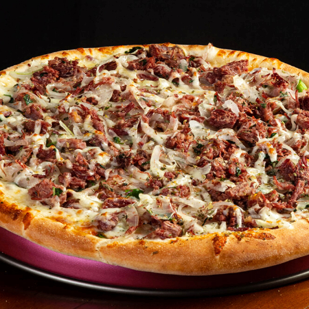 (4 Fatias) Massa artesanal, molho de tomate, mussarela, carne seca, cebola, cream cheese, tomate e orégano