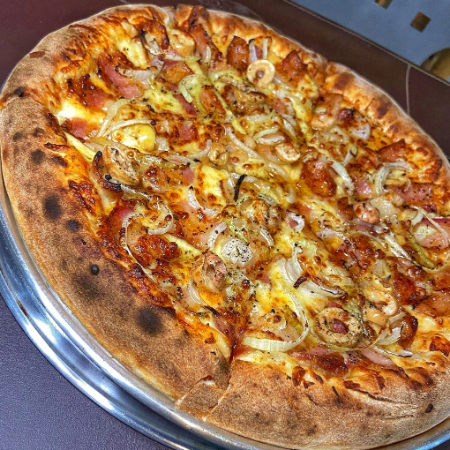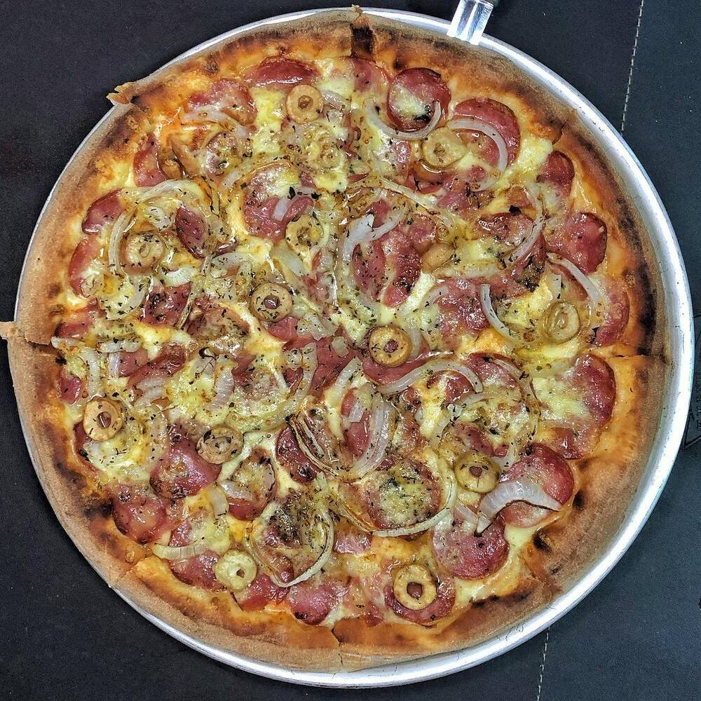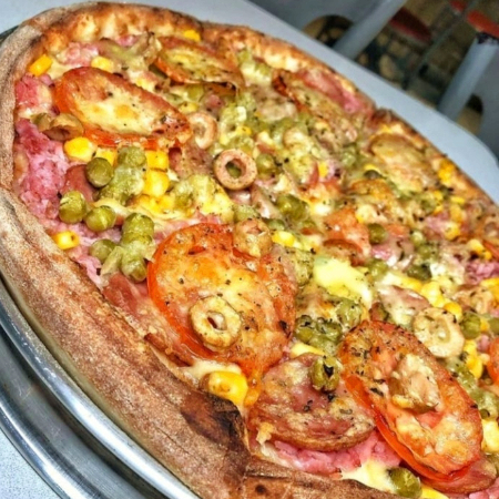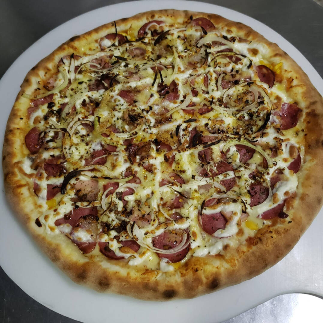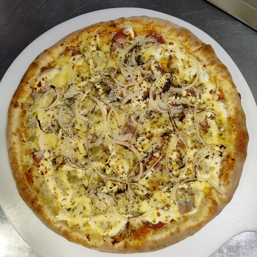 Massa artesanal, molho de tomate, mussarela, calabresa fatiada, requeijão cremoso, milho, bacon, cebola, pimenta calabresa e orégano