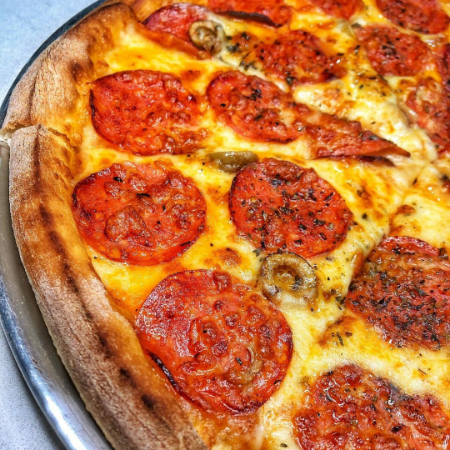Massa artesanal, molho de tomate, mussarela, peperoni e orégano