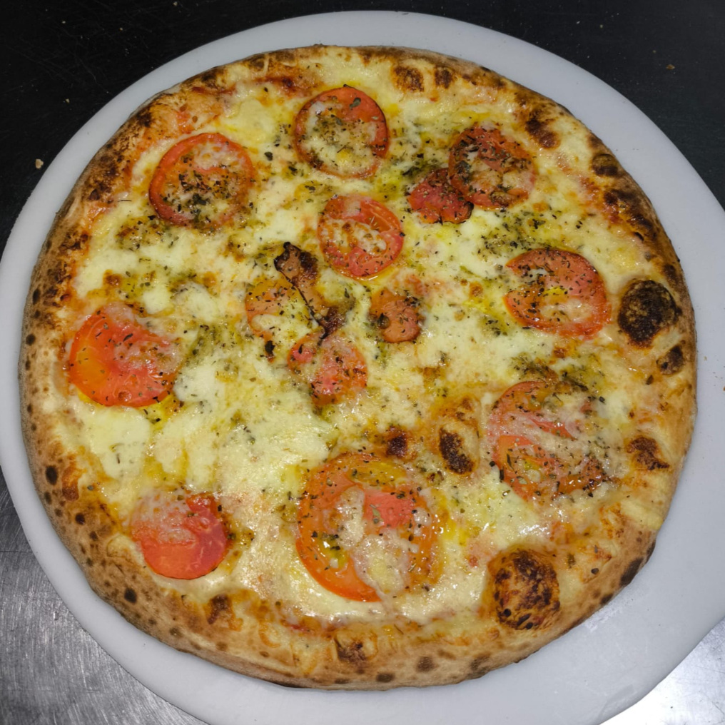 Massa artesanal, molho de tomate, mussarela, bacon, cebola e orégano