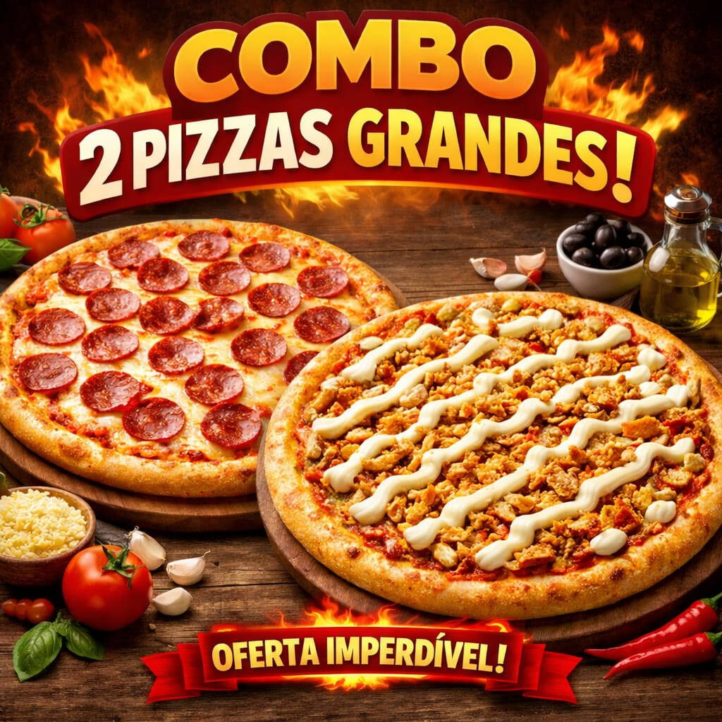 promocao de duas pizzas GRANDE qualquer sabor 66,49 as pizzas GRANDE tem tamanho tradicional de 35 cm e 8 fatias. OBS. nos nao trabalhamos com pizzas meio a meio