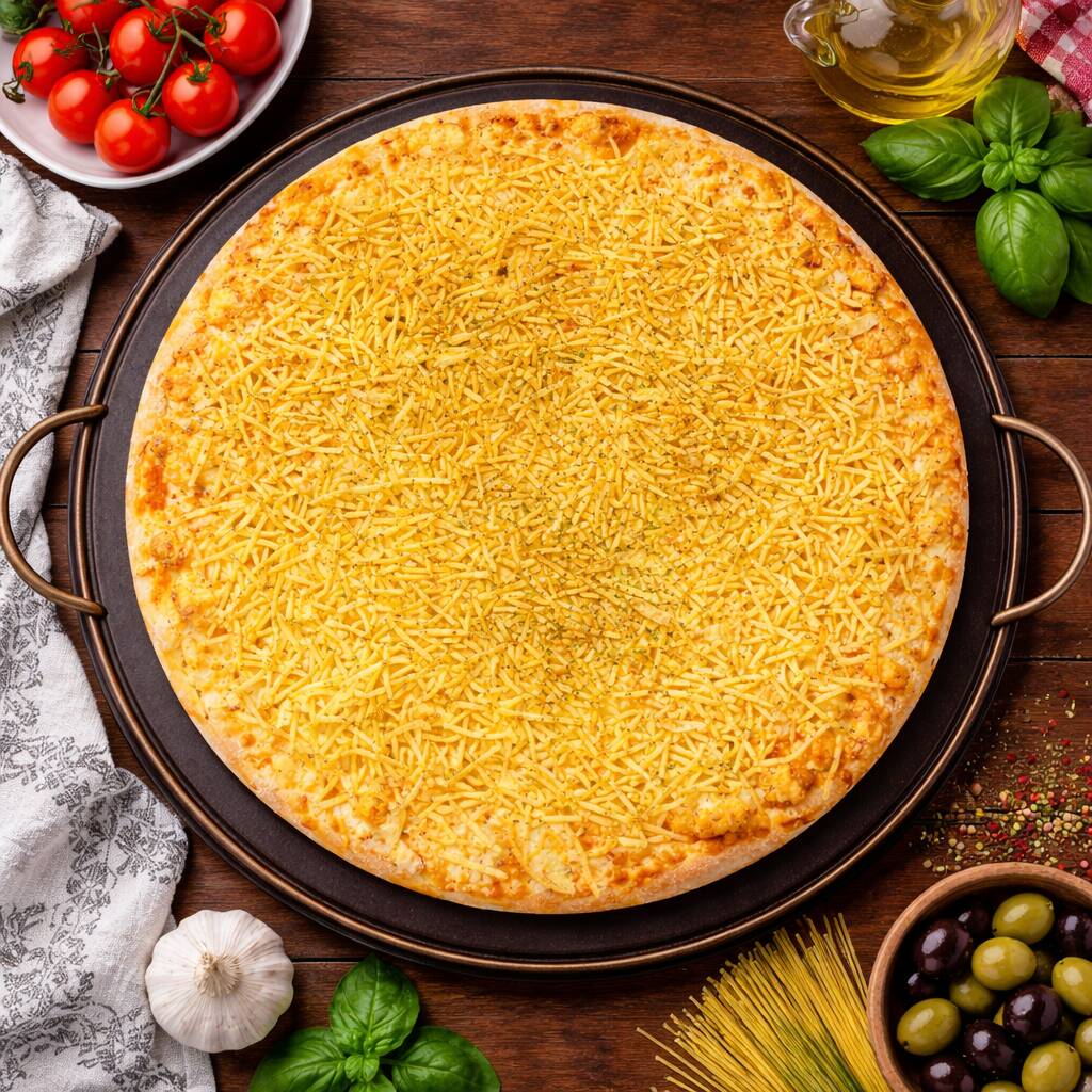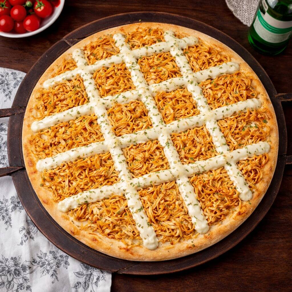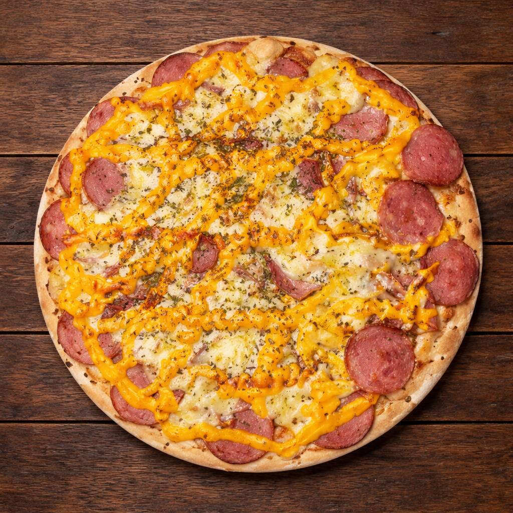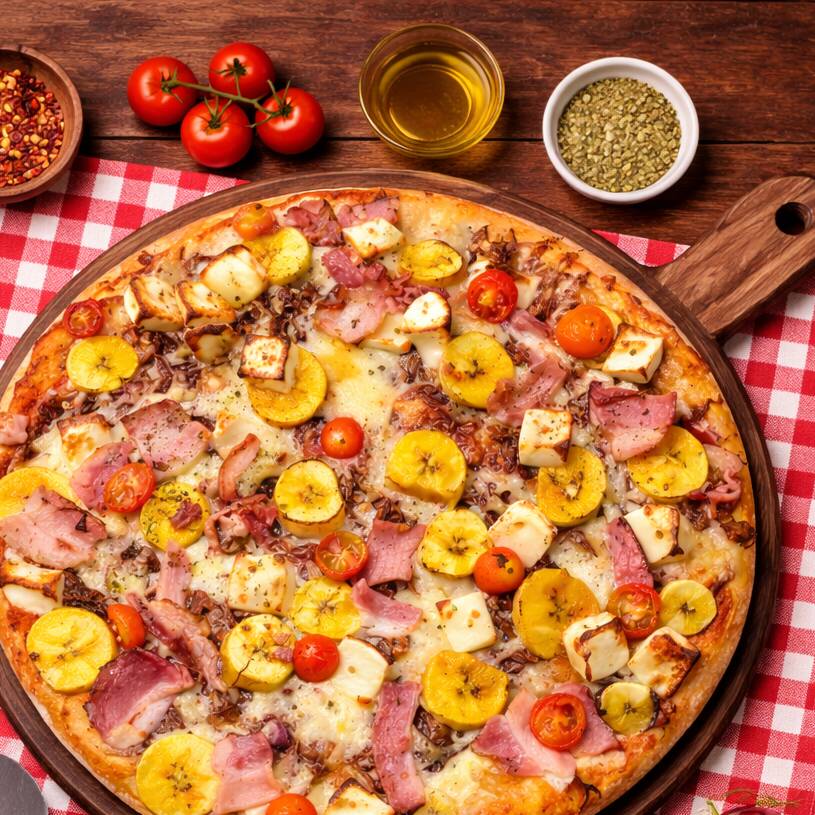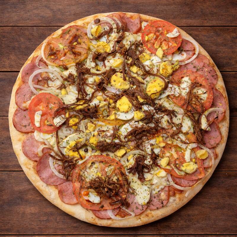 Molho, mussarela, carne de sol, banana , bacon e orégano.
