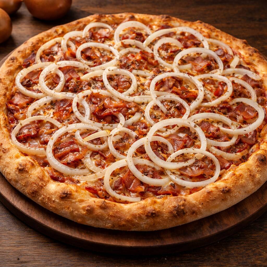 Molho de tomate, mussarela, bacon, cebola e orégano