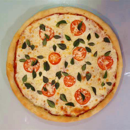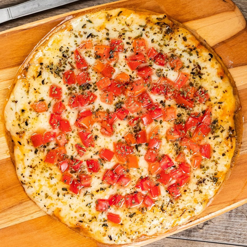 molho de tomate, Mussarela, Tomate em Rodelas, Manjericão e orégano)