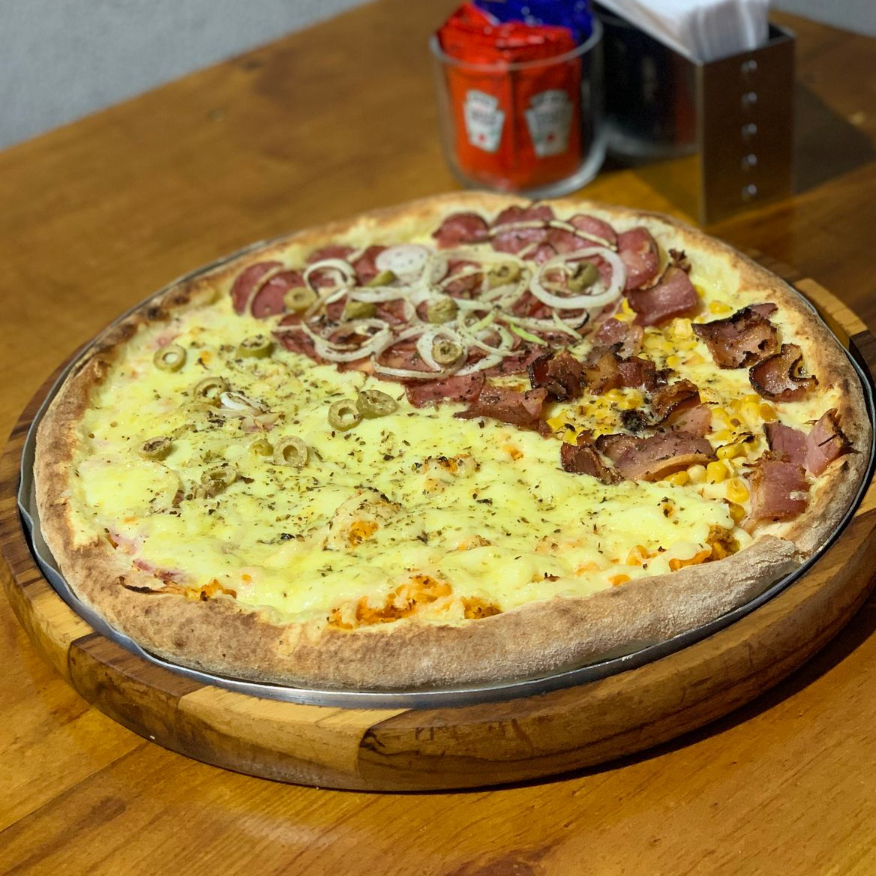 Pizza com 4 sabores (2 fatias de Frango, 2 fatias Calabresa, 2 fatias catuporto, 2 fatias bacon com milho