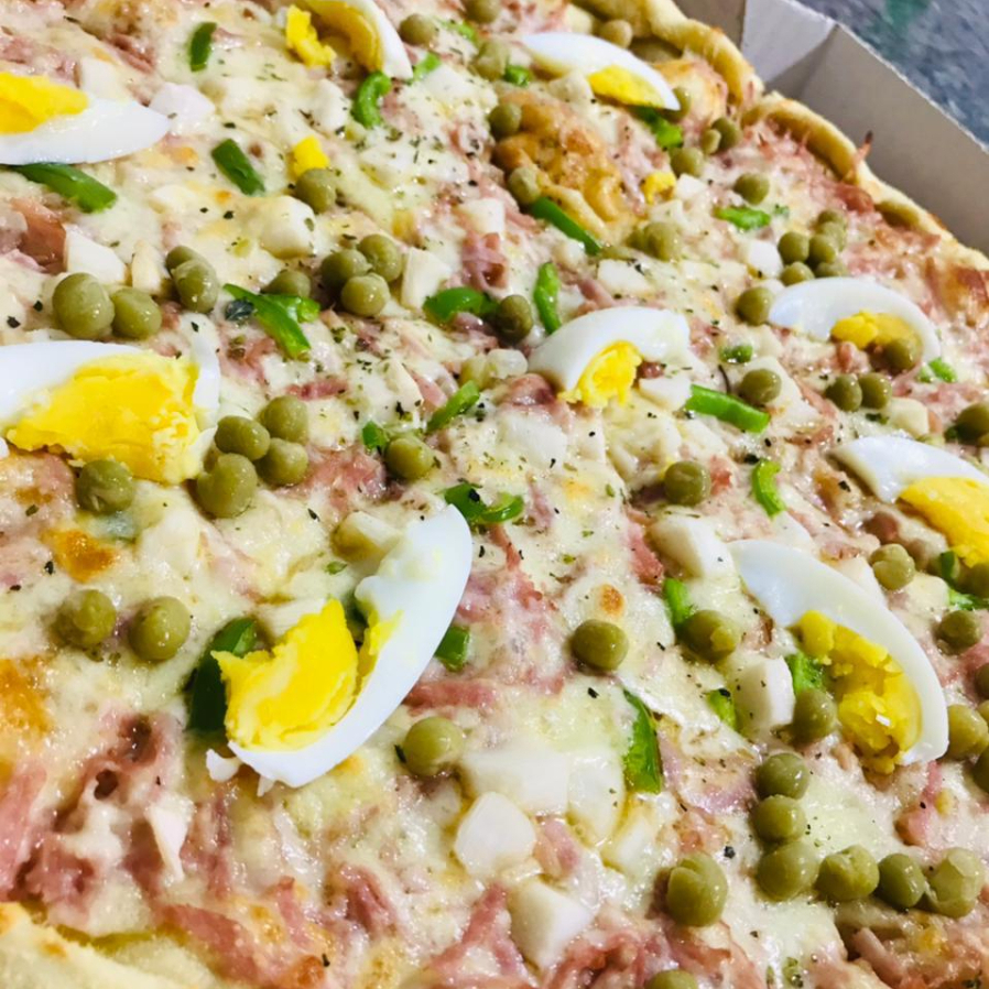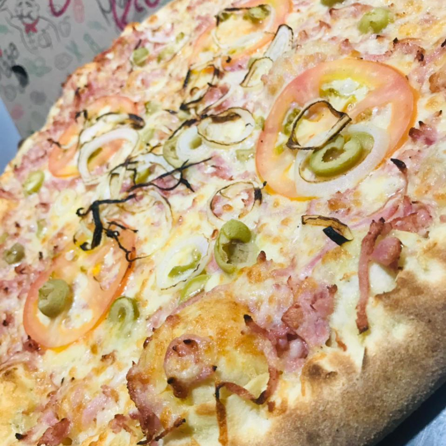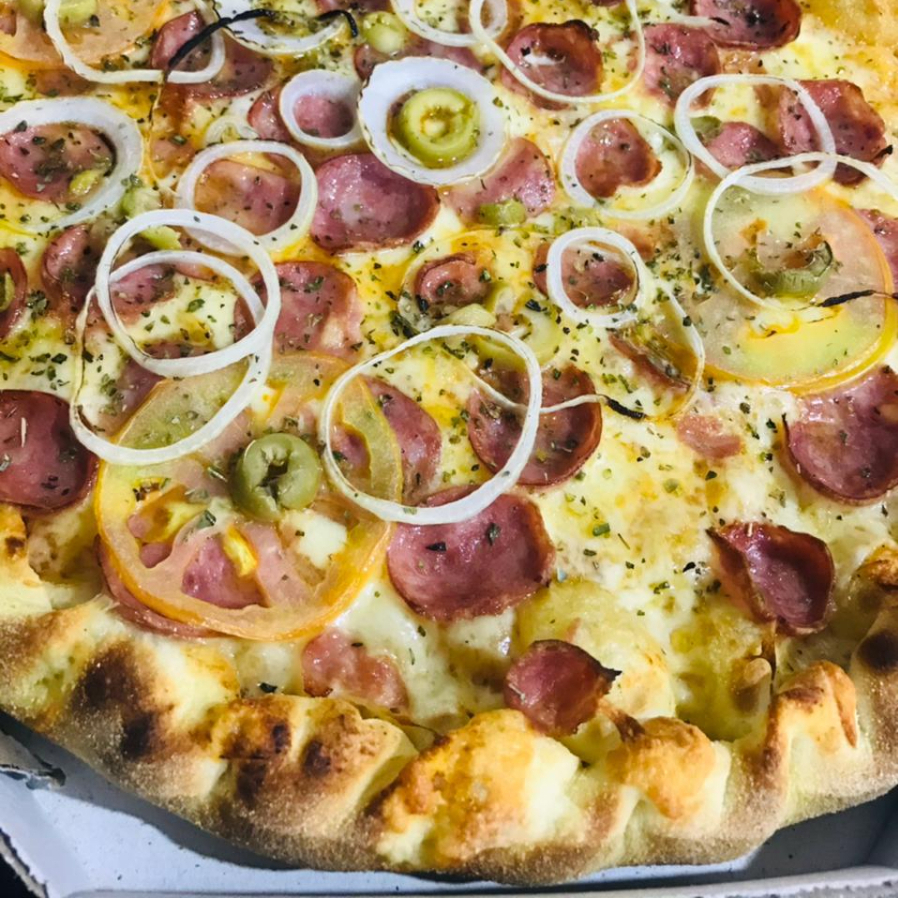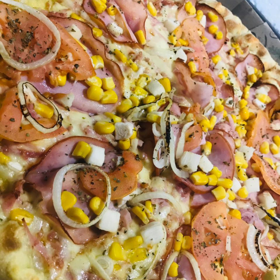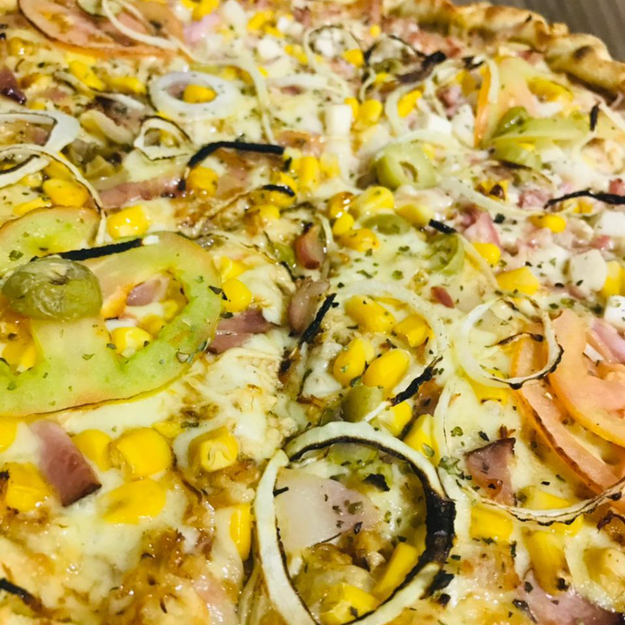 MOLHO, MUSSARELA, PRESUNTO, CALABRESA, FRANGO, BACON, TOMATE CEBOLA, MILHO E ÓREGANO