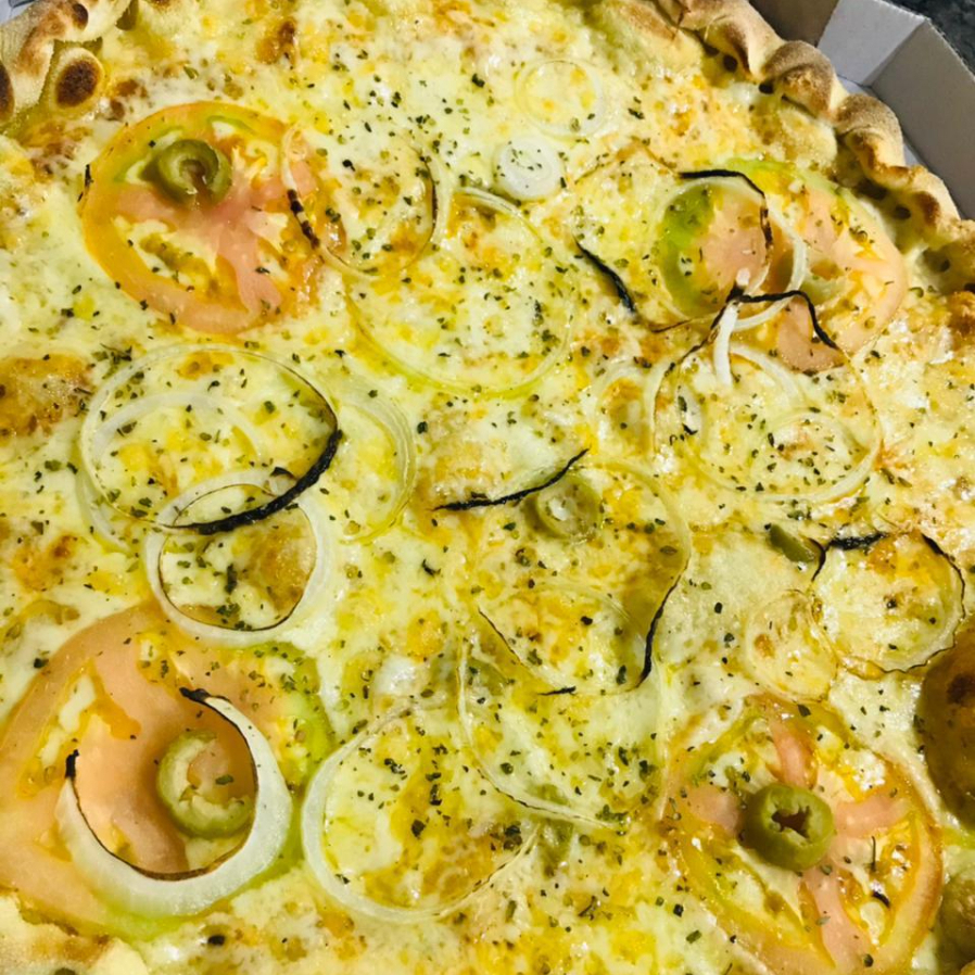 MOLHO, MUSSARELA, CALABRESA, FRANGO, PALMITO PRESUNTO, MILHO, TOMATE, CEBOLA E ORÉGANO,