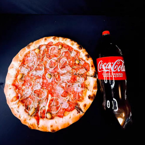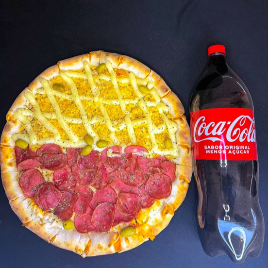MOLHO, MUSSARELA, CALABRESA, CEBOLA, OREGANO, AZEITONA + BORDA CATUPIRY GRATIS + COCA COLA 2 LITROS