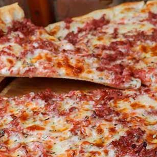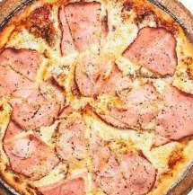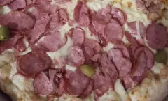 Molho, calabresa, presunto, milho, cebola, mussarela, orégano e azeitona