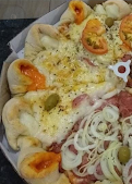 molho, mussarela, calabresa, catupiry, oregano e azeitona