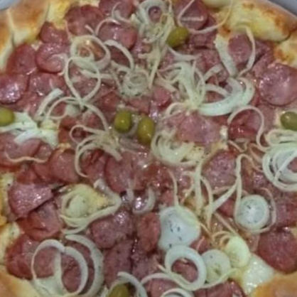 Molho, mussarela, calabresa, cebola, oregano e azeitona