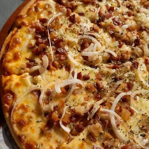 molho, mussarela, catupiry, bacon, cebola, oregano e azeitona