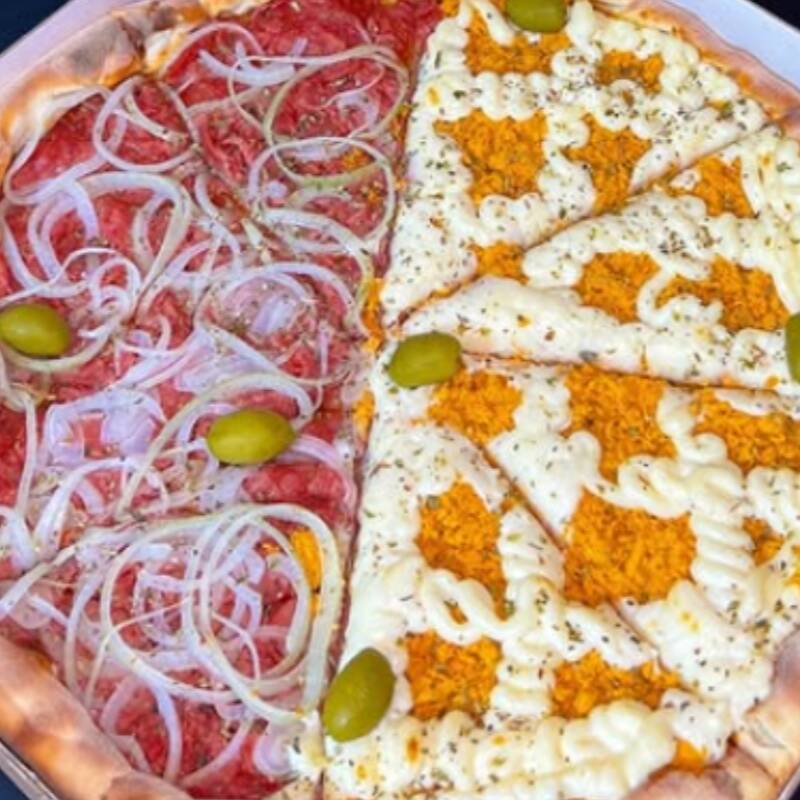 De um lado, calabresa fatiada com cebola dourada, mussarela cremosa, molho especial, tomate e orégano. Do outro, frango desfiado com Catupiry, tomate, mussarela e orégano. Duas delícias em uma só pizza