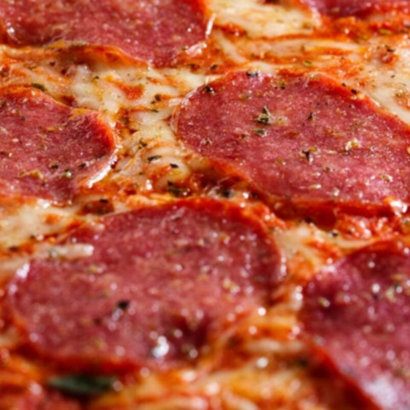Calabresa Fatiada com Cebola Dourada, Mussarela Cremosa, Molho Especial, Tomate e Orégano.