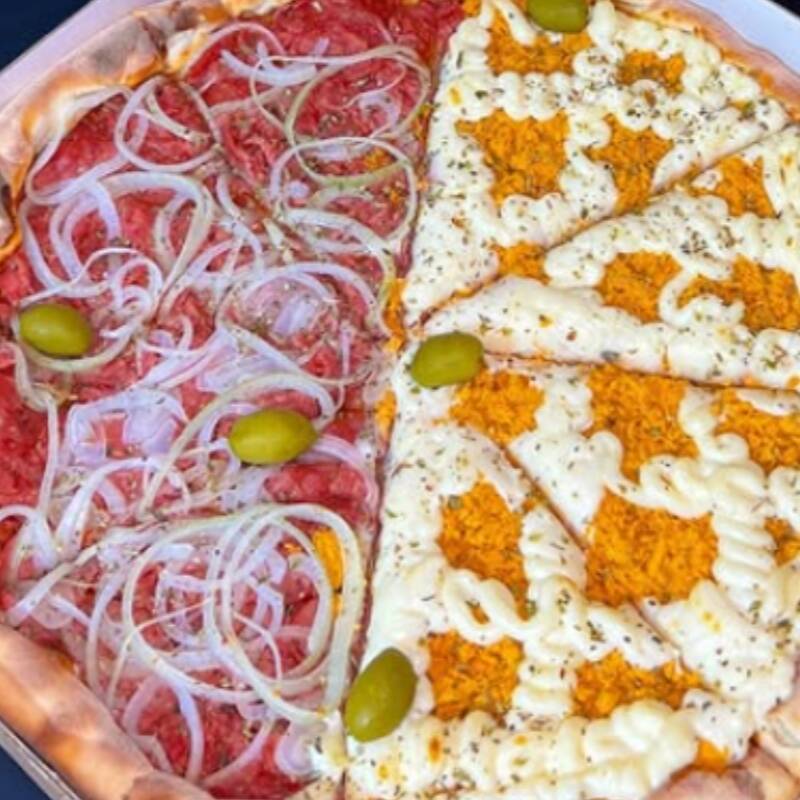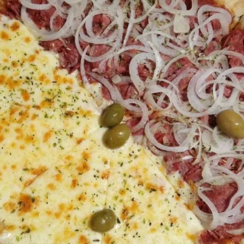 Metade calabresa suculenta e metade mussarela derretida, com cebola, azeitonas e molho de tomate.