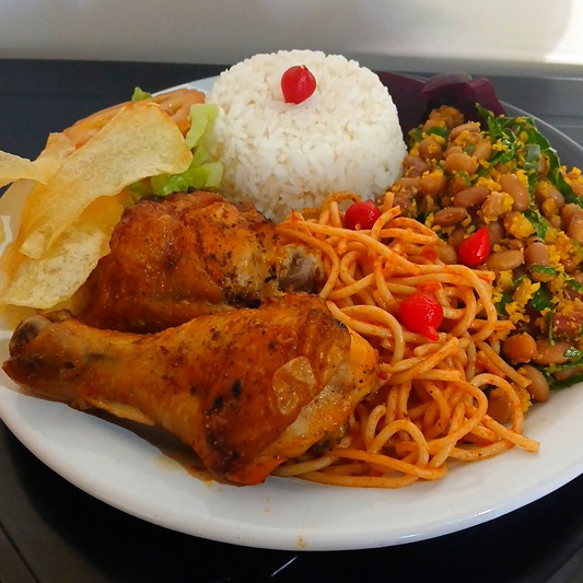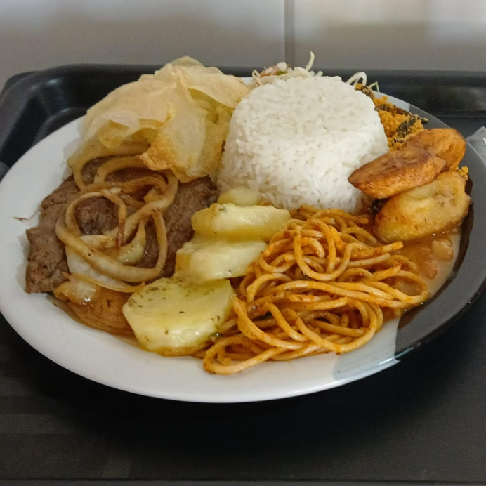 Acompanha: arroz, feijão de caldo, macarrão, mix de verduras, salada do dia, batata sauté ou batata chips, banana frita e farofa.